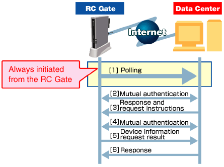 - The RC Gate regularly polls the Ricoh Group side to report its operational status, and to verify the instruction sent by the Data Center. When the devices are accessed from the Data Center for purposes such as firmware updates, communication is only enabled after mutual cross-checking when the RC Gate polls the Data Center at regular intervals. Therefore, the Ricoh Group will never initiate an RC Gate action from the Internet.